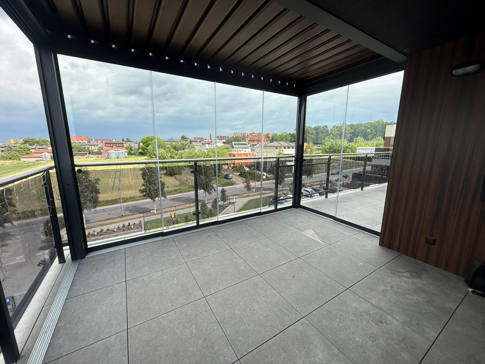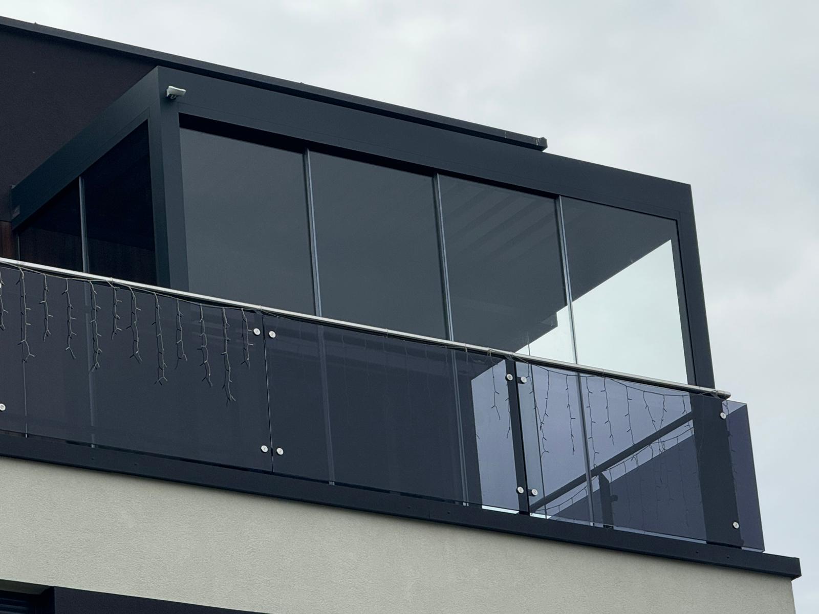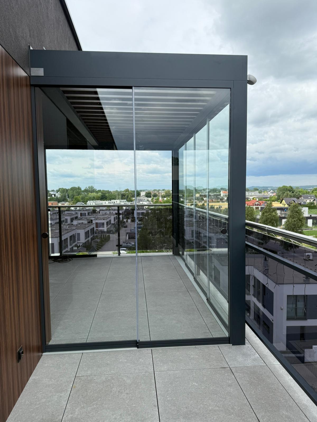 Na czwartej kondygnacji zamontowaliśmy elegancką pergolę z systemem szkła przesuwnego – idealne rozwiązanie na każdą porę roku!