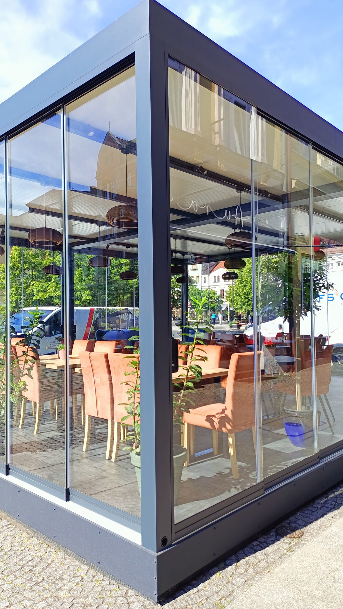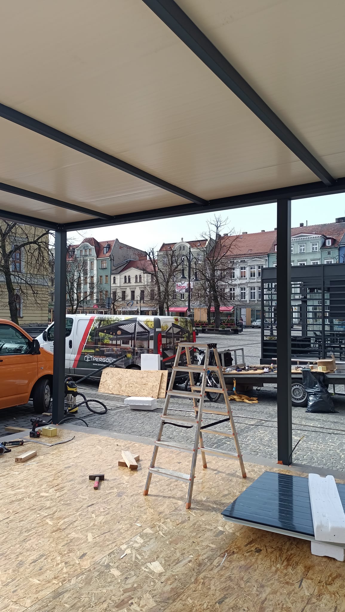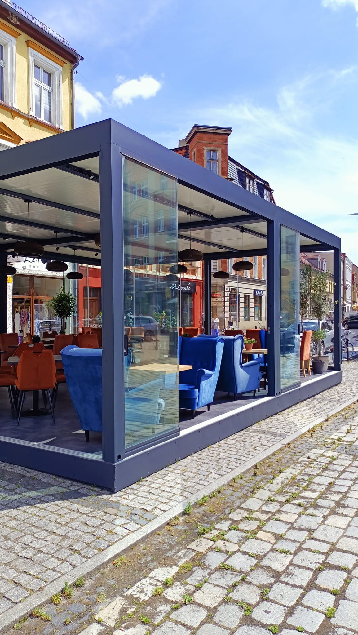 Realizacja dla restauracji Aura (Ostrów Wielkopolski) obejmowała pergolę o wymiarach 7×8 m z dachem z płyty warstwowej, docieplaną podłogą i systemem szklanych paneli przesuwnych. Konstrukcja zapewnia doskonałą izolację, nowoczesny wygląd i komfort użytkowania przez cały rok.