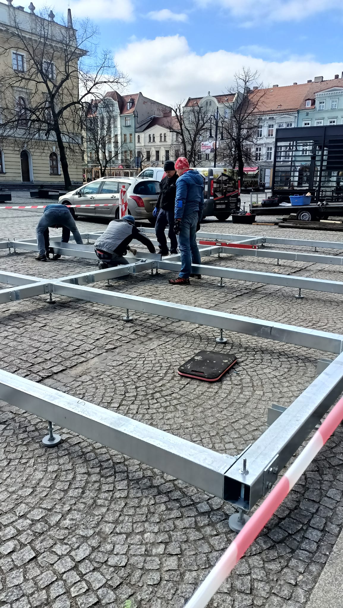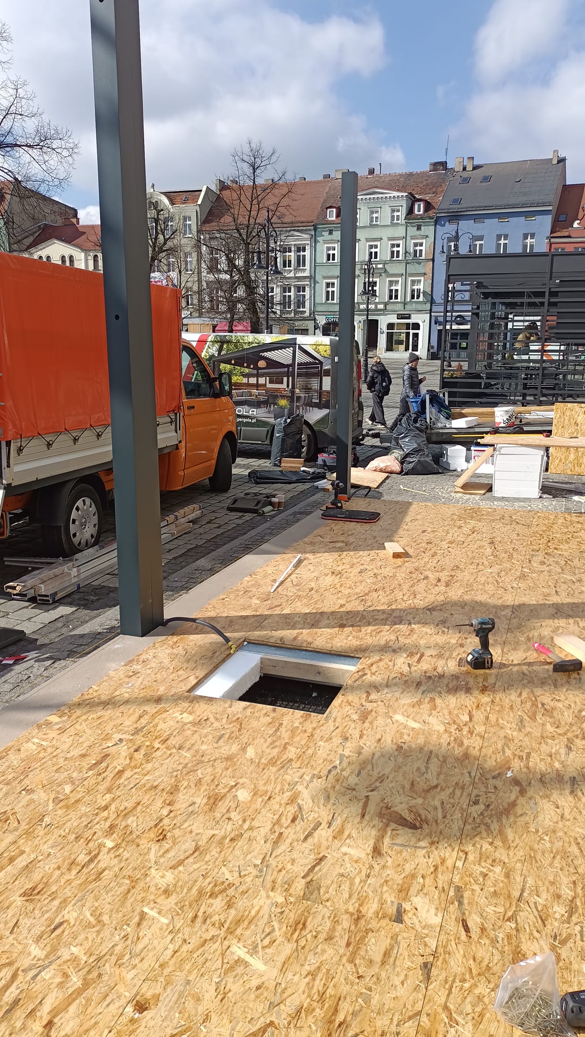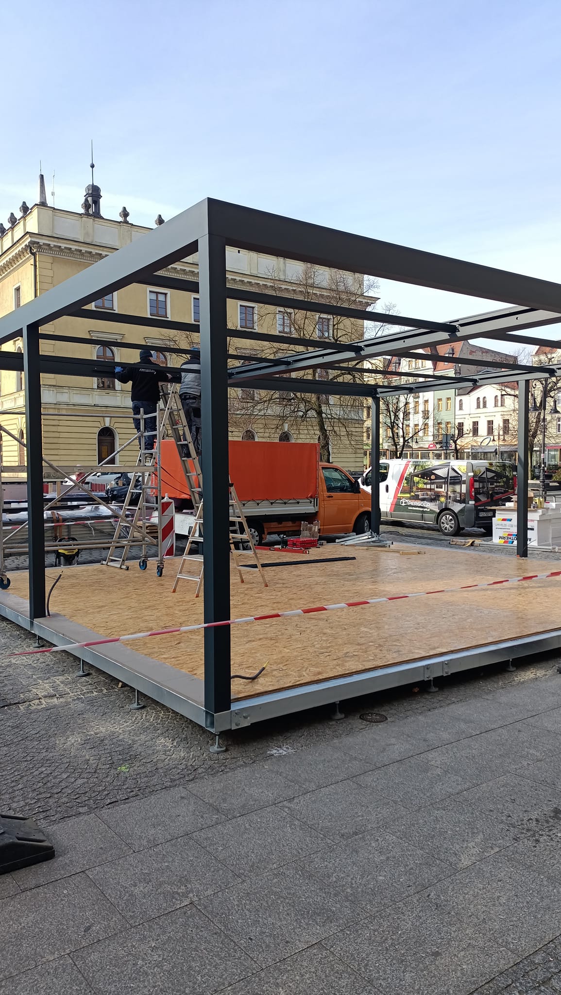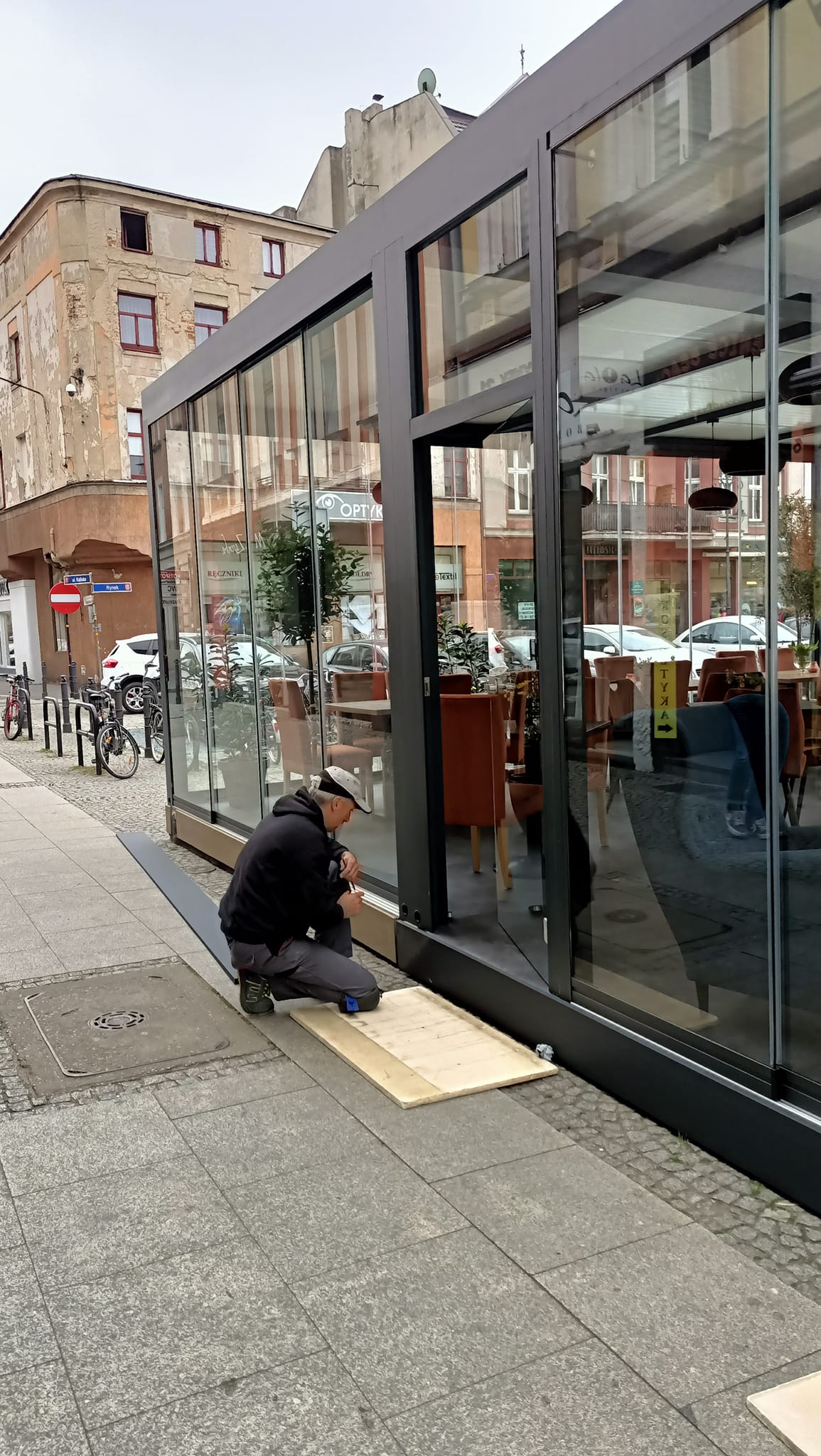 Realizacja dla restauracji Aura (Ostrów Wielkopolski) obejmowała pergolę o wymiarach 7×8 m z dachem z płyty warstwowej, docieplaną podłogą i systemem szklanych paneli przesuwnych. Konstrukcja zapewnia doskonałą izolację, nowoczesny wygląd i komfort użytkowania przez cały rok.